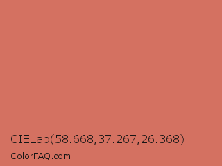 CIELab 58.668,37.267,26.368 Color is a light red color and the nearest color is Japonica #d87c63. Hex code #d47161 and RGB value is rgb(212,113,97). In RGB color space, this color is composed of 83% red, 44% green, 38% blue, In CMYK color space, this color is composed of 0% cyan, 47% magenta, 54% yellow , 17% black , In HSL color space, this color has a hue angle of 8° , 57% saturation and 61% lightness.