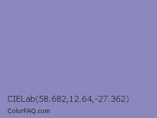 CIELab 58.682,12.64,-27.362 Color is a light indigo color and the nearest color is Wild Blue Yonder #7a89b8. Hex code #8a88bd and RGB value is rgb(138,136,189). In RGB color space, this color is composed of 54% red, 53% green, 74% blue, In CMYK color space, this color is composed of 27% cyan, 28% magenta, 0% yellow , 26% black , In HSL color space, this color has a hue angle of 242° , 29% saturation and 64% lightness.