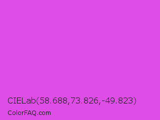 CIELab 58.688,73.826,-49.823 Color is a normal magenta color and the nearest color is Purple Pizzazz #fe4eda. Hex code #de4ee6 and RGB value is rgb(222,78,230). In RGB color space, this color is composed of 87% red, 31% green, 90% blue, In CMYK color space, this color is composed of 3% cyan, 66% magenta, 0% yellow , 10% black , In HSL color space, this color has a hue angle of 297° , 75% saturation and 60% lightness.