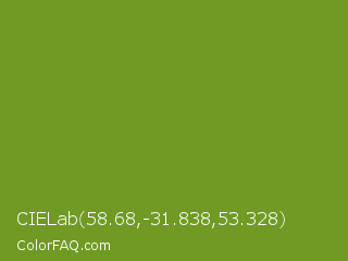 CIELab 58.68,-31.838,53.328 Color is a normal green color and the nearest color is Olive Drab #6b8e23. Hex code #709a24 and RGB value is rgb(112,154,36). In RGB color space, this color is composed of 44% red, 60% green, 14% blue, In CMYK color space, this color is composed of 27% cyan, 0% magenta, 77% yellow , 40% black , In HSL color space, this color has a hue angle of 81° , 62% saturation and 37% lightness.
