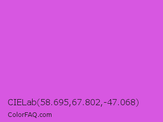 CIELab 58.695,67.802,-47.068 Color is a light magenta color and the nearest color is Orchid #da70d6. Hex code #d757e1 and RGB value is rgb(215,87,225). In RGB color space, this color is composed of 84% red, 34% green, 88% blue, In CMYK color space, this color is composed of 4% cyan, 61% magenta, 0% yellow , 12% black , In HSL color space, this color has a hue angle of 296° , 70% saturation and 61% lightness.