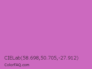 CIELab 58.698,50.705,-27.912 Color is a light magenta color and the nearest color is Sky Magenta #cf71af. Hex code #cc69bf and RGB value is rgb(204,105,191). In RGB color space, this color is composed of 80% red, 41% green, 75% blue, In CMYK color space, this color is composed of 0% cyan, 49% magenta, 6% yellow , 20% black , In HSL color space, this color has a hue angle of 308° , 49% saturation and 61% lightness.