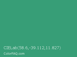CIELab 58.6,-39.112,11.827 Color is a normal green color and the nearest color is Illuminating Emerald #319177. Hex code #379e77 and RGB value is rgb(55,158,119). In RGB color space, this color is composed of 22% red, 62% green, 47% blue, In CMYK color space, this color is composed of 65% cyan, 0% magenta, 25% yellow , 38% black , In HSL color space, this color has a hue angle of 157° , 48% saturation and 42% lightness.