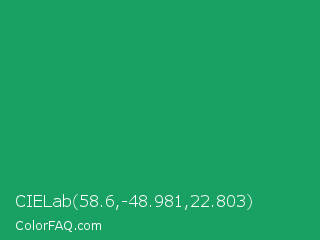 CIELab 58.6,-48.981,22.803 Color is a normal green color and the nearest color is Green Crayola #1cac78. Hex code #19a163 and RGB value is rgb(25,161,99). In RGB color space, this color is composed of 10% red, 63% green, 39% blue, In CMYK color space, this color is composed of 84% cyan, 0% magenta, 39% yellow , 37% black , In HSL color space, this color has a hue angle of 153° , 73% saturation and 36% lightness.