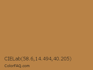 CIELab 58.6,14.494,40.205 Color is a normal orange color and the nearest color is Driftwood #af8751. Hex code #b88246 and RGB value is rgb(184,130,70). In RGB color space, this color is composed of 72% red, 51% green, 27% blue, In CMYK color space, this color is composed of 0% cyan, 29% magenta, 62% yellow , 28% black , In HSL color space, this color has a hue angle of 32° , 45% saturation and 50% lightness.