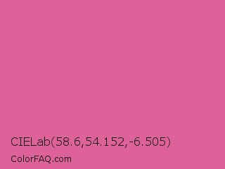 CIELab 58.6,54.152,-6.505 Color is a light rose color and the nearest color is Thulian Pink #de6fa1. Hex code #de629a and RGB value is rgb(222,98,154). In RGB color space, this color is composed of 87% red, 38% green, 60% blue, In CMYK color space, this color is composed of 0% cyan, 56% magenta, 31% yellow , 13% black , In HSL color space, this color has a hue angle of 333° , 65% saturation and 63% lightness.