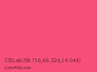 CIELab 58.716,66.324,14.044 Color is a light red color and the nearest color is Fiery Rose #ff5470. Hex code #f74f78 and RGB value is rgb(247,79,120). In RGB color space, this color is composed of 97% red, 31% green, 47% blue, In CMYK color space, this color is composed of 0% cyan, 68% magenta, 51% yellow , 3% black , In HSL color space, this color has a hue angle of 345° , 91% saturation and 64% lightness.