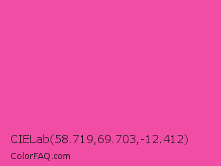 CIELab 58.719,69.703,-12.412 Color is a light rose color and the nearest color is Brilliant Rose #f653a6. Hex code #f14da5 and RGB value is rgb(241,77,165). In RGB color space, this color is composed of 95% red, 30% green, 65% blue, In CMYK color space, this color is composed of 0% cyan, 68% magenta, 32% yellow , 5% black , In HSL color space, this color has a hue angle of 328° , 85% saturation and 62% lightness.