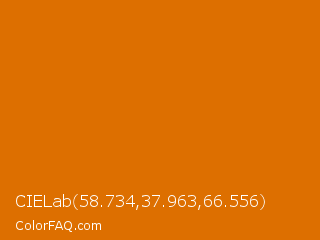 CIELab 58.734,37.963,66.556 Color is a normal orange color and the nearest color is Mango Tango Crayola #e77200. Hex code #dd6f00 and RGB value is rgb(221,111,0). In RGB color space, this color is composed of 87% red, 44% green, 0% blue, In CMYK color space, this color is composed of 0% cyan, 50% magenta, 100% yellow , 13% black , In HSL color space, this color has a hue angle of 30° , 100% saturation and 43% lightness.