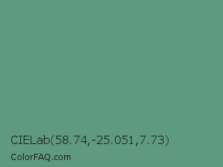 CIELab 58.74,-25.051,7.73 Color is a normal green color and the nearest color is Shiny Shamrock #5fa778. Hex code #5f997f and RGB value is rgb(95,153,127). In RGB color space, this color is composed of 37% red, 60% green, 50% blue, In CMYK color space, this color is composed of 38% cyan, 0% magenta, 17% yellow , 40% black , In HSL color space, this color has a hue angle of 153° , 23% saturation and 49% lightness.