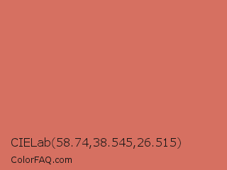 CIELab 58.74,38.545,26.515 Color is a light red color and the nearest color is Japonica #d87c63. Hex code #d67061 and RGB value is rgb(214,112,97). In RGB color space, this color is composed of 84% red, 44% green, 38% blue, In CMYK color space, this color is composed of 0% cyan, 48% magenta, 55% yellow , 16% black , In HSL color space, this color has a hue angle of 8° , 59% saturation and 61% lightness.