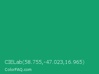 CIELab 58.755,-47.023,16.965 Color is a normal green color and the nearest color is Green Crayola #1cac78. Hex code #14a16e and RGB value is rgb(20,161,110). In RGB color space, this color is composed of 8% red, 63% green, 43% blue, In CMYK color space, this color is composed of 88% cyan, 0% magenta, 32% yellow , 37% black , In HSL color space, this color has a hue angle of 158° , 78% saturation and 35% lightness.