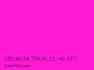 CIELab 58.759,91.12,-40.327 Color is a normal magenta color and the nearest color is Hot Magenta #ff1dce. Hex code #ff18d6 and RGB value is rgb(255,24,214). In RGB color space, this color is composed of 100% red, 9% green, 84% blue, In CMYK color space, this color is composed of 0% cyan, 91% magenta, 16% yellow , 0% black , In HSL color space, this color has a hue angle of 311° , 100% saturation and 55% lightness.