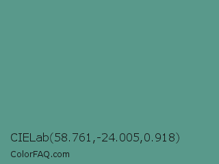 CIELab 58.761,-24.005,0.918 Color is a normal cyan color and the nearest color is Patina #639a8f. Hex code #59998b and RGB value is rgb(89,153,139). In RGB color space, this color is composed of 35% red, 60% green, 55% blue, In CMYK color space, this color is composed of 42% cyan, 0% magenta, 9% yellow , 40% black , In HSL color space, this color has a hue angle of 167° , 26% saturation and 47% lightness.