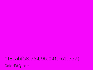 CIELab 58.764,96.041,-61.757 Color is a normal magenta color and the nearest color is Magenta / Fuchsia #ff00ff. Hex code #f607fc and RGB value is rgb(246,7,252). In RGB color space, this color is composed of 96% red, 3% green, 99% blue, In CMYK color space, this color is composed of 2% cyan, 97% magenta, 0% yellow , 1% black , In HSL color space, this color has a hue angle of 299° , 98% saturation and 51% lightness.