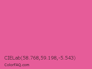 CIELab 58.768,59.198,-5.543 Color is a light rose color and the nearest color is Raspberry Pink #e25098. Hex code #e65c99 and RGB value is rgb(230,92,153). In RGB color space, this color is composed of 90% red, 36% green, 60% blue, In CMYK color space, this color is composed of 0% cyan, 60% magenta, 33% yellow , 10% black , In HSL color space, this color has a hue angle of 333° , 73% saturation and 63% lightness.