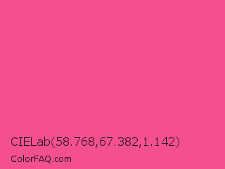 CIELab 58.768,67.382,1.142 Color is a light rose color and the nearest color is French Rose #f64a8a. Hex code #f44f8e and RGB value is rgb(244,79,142). In RGB color space, this color is composed of 96% red, 31% green, 56% blue, In CMYK color space, this color is composed of 0% cyan, 68% magenta, 42% yellow , 4% black , In HSL color space, this color has a hue angle of 337° , 88% saturation and 63% lightness.