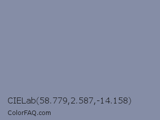 CIELab 58.779,2.587,-14.158 Color is a normal blue color and the nearest color is Manatee Crayola #8d90a1. Hex code #858da6 and RGB value is rgb(133,141,166). In RGB color space, this color is composed of 52% red, 55% green, 65% blue, In CMYK color space, this color is composed of 20% cyan, 15% magenta, 0% yellow , 35% black , In HSL color space, this color has a hue angle of 225° , 16% saturation and 59% lightness.