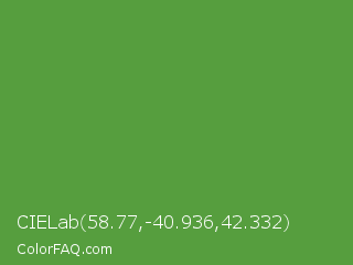 CIELab 58.77,-40.936,42.332 Color is a normal green color and the nearest color is Apple #4fa83d. Hex code #569e3e and RGB value is rgb(86,158,62). In RGB color space, this color is composed of 34% red, 62% green, 24% blue, In CMYK color space, this color is composed of 46% cyan, 0% magenta, 61% yellow , 38% black , In HSL color space, this color has a hue angle of 105° , 44% saturation and 43% lightness.