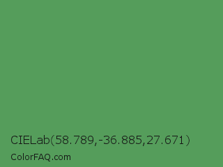 CIELab 58.789,-36.885,27.671 Color is a normal green color and the nearest color is Fruit Salad #4f9d5d. Hex code #559d5b and RGB value is rgb(85,157,91). In RGB color space, this color is composed of 33% red, 62% green, 36% blue, In CMYK color space, this color is composed of 46% cyan, 0% magenta, 42% yellow , 38% black , In HSL color space, this color has a hue angle of 125° , 30% saturation and 47% lightness.