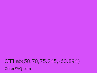 CIELab 58.78,75.245,-60.894 Color is a light purple color and the nearest color is Heliotrope #df73ff. Hex code #d64ffa and RGB value is rgb(214,79,250). In RGB color space, this color is composed of 84% red, 31% green, 98% blue, In CMYK color space, this color is composed of 14% cyan, 68% magenta, 0% yellow , 2% black , In HSL color space, this color has a hue angle of 287° , 94% saturation and 65% lightness.