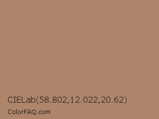 CIELab 58.802,12.022,20.62 Color is a normal orange color and the nearest color is Light Taupe #b38b6d. Hex code #ae856a and RGB value is rgb(174,133,106). In RGB color space, this color is composed of 68% red, 52% green, 42% blue, In CMYK color space, this color is composed of 0% cyan, 24% magenta, 39% yellow , 32% black , In HSL color space, this color has a hue angle of 24° , 30% saturation and 55% lightness.