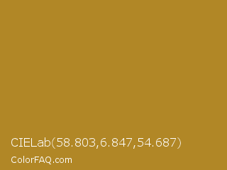 CIELab 58.803,6.847,54.687 Color is a normal orange color and the nearest color is University Of California Gold #b78727. Hex code #b18726 and RGB value is rgb(177,135,38). In RGB color space, this color is composed of 69% red, 53% green, 15% blue, In CMYK color space, this color is composed of 0% cyan, 24% magenta, 79% yellow , 31% black , In HSL color space, this color has a hue angle of 42° , 65% saturation and 42% lightness.