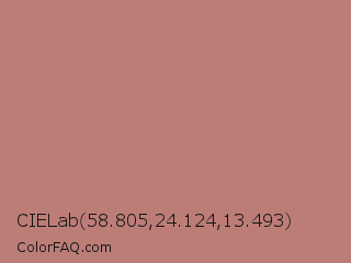 CIELab 58.805,24.124,13.493 Color is a normal red color and the nearest color is Old Rose #c08081. Hex code #bd7d77 and RGB value is rgb(189,125,119). In RGB color space, this color is composed of 74% red, 49% green, 47% blue, In CMYK color space, this color is composed of 0% cyan, 34% magenta, 37% yellow , 26% black , In HSL color space, this color has a hue angle of 5° , 35% saturation and 60% lightness.