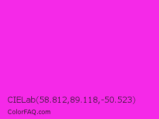 CIELab 58.812,89.118,-50.523 Color is a normal magenta color and the nearest color is Hot Magenta #ff1dce. Hex code #f529e8 and RGB value is rgb(245,41,232). In RGB color space, this color is composed of 96% red, 16% green, 91% blue, In CMYK color space, this color is composed of 0% cyan, 83% magenta, 5% yellow , 4% black , In HSL color space, this color has a hue angle of 304° , 91% saturation and 56% lightness.