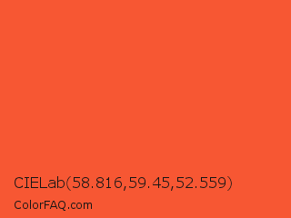 CIELab 58.816,59.45,52.559 Color is a normal red color and the nearest color is Portland Orange #ff5a36. Hex code #f75733 and RGB value is rgb(247,87,51). In RGB color space, this color is composed of 97% red, 34% green, 20% blue, In CMYK color space, this color is composed of 0% cyan, 65% magenta, 79% yellow , 3% black , In HSL color space, this color has a hue angle of 11° , 92% saturation and 58% lightness.