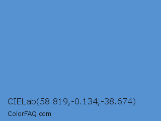 CIELab 58.819,-0.134,-38.674 Color is a normal blue color and the nearest color is Havelock Blue #5590d9. Hex code #5691d1 and RGB value is rgb(86,145,209). In RGB color space, this color is composed of 34% red, 57% green, 82% blue, In CMYK color space, this color is composed of 59% cyan, 31% magenta, 0% yellow , 18% black , In HSL color space, this color has a hue angle of 211° , 57% saturation and 58% lightness.