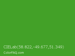 CIELab 58.822,-49.677,51.349 Color is a normal green color and the nearest color is Apple #4fa83d. Hex code #43a128 and RGB value is rgb(67,161,40). In RGB color space, this color is composed of 26% red, 63% green, 16% blue, In CMYK color space, this color is composed of 58% cyan, 0% magenta, 75% yellow , 37% black , In HSL color space, this color has a hue angle of 107° , 60% saturation and 39% lightness.