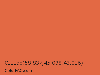 CIELab 58.837,45.038,43.016 Color is a normal red color and the nearest color is Red Damask #da6a41. Hex code #e36944 and RGB value is rgb(227,105,68). In RGB color space, this color is composed of 89% red, 41% green, 27% blue, In CMYK color space, this color is composed of 0% cyan, 54% magenta, 70% yellow , 11% black , In HSL color space, this color has a hue angle of 14° , 74% saturation and 58% lightness.