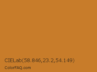 CIELab 58.846,23.2,54.149 Color is a normal orange color and the nearest color is Brandy Punch #cd8429. Hex code #c87c2a and RGB value is rgb(200,124,42). In RGB color space, this color is composed of 78% red, 49% green, 16% blue, In CMYK color space, this color is composed of 0% cyan, 38% magenta, 79% yellow , 22% black , In HSL color space, this color has a hue angle of 31° , 65% saturation and 47% lightness.