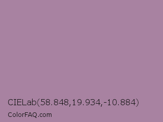 CIELab 58.848,19.934,-10.884 Color is a normal magenta color and the nearest color is Bouquet #ae809e. Hex code #a882a1 and RGB value is rgb(168,130,161). In RGB color space, this color is composed of 66% red, 51% green, 63% blue, In CMYK color space, this color is composed of 0% cyan, 23% magenta, 4% yellow , 34% black , In HSL color space, this color has a hue angle of 311° , 18% saturation and 58% lightness.
