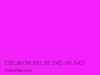CIELab 58.851,92.545,-60.543 Color is a normal magenta color and the nearest color is Magenta / Fuchsia #ff00ff. Hex code #f221fa and RGB value is rgb(242,33,250). In RGB color space, this color is composed of 95% red, 13% green, 98% blue, In CMYK color space, this color is composed of 3% cyan, 87% magenta, 0% yellow , 2% black , In HSL color space, this color has a hue angle of 298° , 96% saturation and 55% lightness.