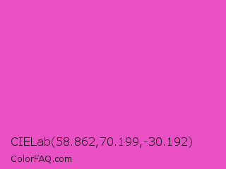CIELab 58.862,70.199,-30.192 Color is a light magenta color and the nearest color is Light Deep Pink #ff5ccd. Hex code #e850c4 and RGB value is rgb(232,80,196). In RGB color space, this color is composed of 91% red, 31% green, 77% blue, In CMYK color space, this color is composed of 0% cyan, 66% magenta, 16% yellow , 9% black , In HSL color space, this color has a hue angle of 314° , 77% saturation and 61% lightness.