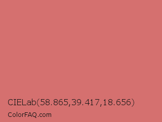 CIELab 58.865,39.417,18.656 Color is a light red color and the nearest color is Contessa #c6726b. Hex code #d5706f and RGB value is rgb(213,112,111). In RGB color space, this color is composed of 84% red, 44% green, 44% blue, In CMYK color space, this color is composed of 0% cyan, 47% magenta, 48% yellow , 16% black , In HSL color space, this color has a hue angle of 1° , 55% saturation and 64% lightness.
