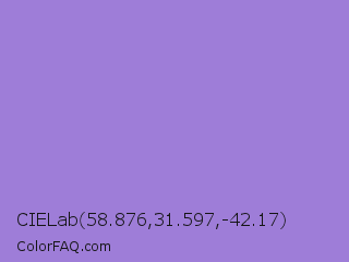 CIELab 58.876,31.597,-42.17 Color is a light violet color and the nearest color is Lilac Bush #9874d3. Hex code #9e7dd8 and RGB value is rgb(158,125,216). In RGB color space, this color is composed of 62% red, 49% green, 85% blue, In CMYK color space, this color is composed of 27% cyan, 42% magenta, 0% yellow , 15% black , In HSL color space, this color has a hue angle of 262° , 54% saturation and 67% lightness.