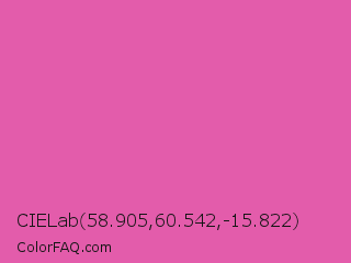 CIELab 58.905,60.542,-15.822 Color is a light magenta color and the nearest color is Brilliant Rose #f653a6. Hex code #e35cab and RGB value is rgb(227,92,171). In RGB color space, this color is composed of 89% red, 36% green, 67% blue, In CMYK color space, this color is composed of 0% cyan, 59% magenta, 25% yellow , 11% black , In HSL color space, this color has a hue angle of 325° , 71% saturation and 63% lightness.