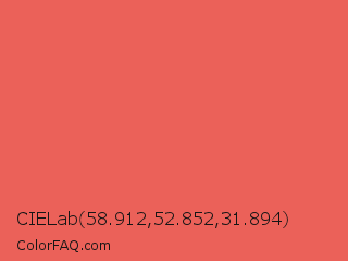 CIELab 58.912,52.852,31.894 Color is a light red color and the nearest color is Roman #de6360. Hex code #eb6159 and RGB value is rgb(235,97,89). In RGB color space, this color is composed of 92% red, 38% green, 35% blue, In CMYK color space, this color is composed of 0% cyan, 59% magenta, 62% yellow , 8% black , In HSL color space, this color has a hue angle of 3° , 78% saturation and 64% lightness.