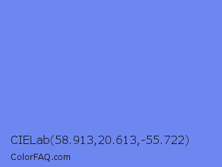 CIELab 58.913,20.613,-55.722 Color is a light blue color and the nearest color is Cornflower Blue #6495ed. Hex code #6e87f0 and RGB value is rgb(110,135,240). In RGB color space, this color is composed of 43% red, 53% green, 94% blue, In CMYK color space, this color is composed of 54% cyan, 44% magenta, 0% yellow , 6% black , In HSL color space, this color has a hue angle of 228° , 81% saturation and 69% lightness.