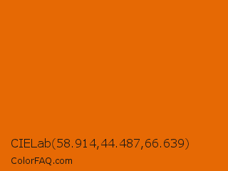 CIELab 58.914,44.487,66.639 Color is a normal orange color and the nearest color is Clementine #e96e00. Hex code #e66904 and RGB value is rgb(230,105,4). In RGB color space, this color is composed of 90% red, 41% green, 2% blue, In CMYK color space, this color is composed of 0% cyan, 54% magenta, 98% yellow , 10% black , In HSL color space, this color has a hue angle of 27° , 97% saturation and 46% lightness.