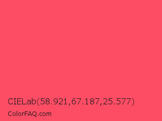 CIELab 58.921,67.187,25.577 Color is a light red color and the nearest color is Infra Red #ff496c. Hex code #fc4d65 and RGB value is rgb(252,77,101). In RGB color space, this color is composed of 99% red, 30% green, 40% blue, In CMYK color space, this color is composed of 0% cyan, 69% magenta, 60% yellow , 1% black , In HSL color space, this color has a hue angle of 352° , 97% saturation and 65% lightness.