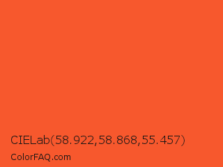 CIELab 58.922,58.868,55.457 Color is a normal red color and the nearest color is Flamingo #f2552a. Hex code #f7582d and RGB value is rgb(247,88,45). In RGB color space, this color is composed of 97% red, 35% green, 18% blue, In CMYK color space, this color is composed of 0% cyan, 64% magenta, 82% yellow , 3% black , In HSL color space, this color has a hue angle of 13° , 93% saturation and 57% lightness.