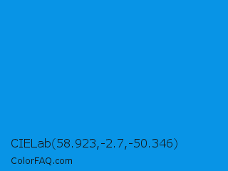 CIELab 58.923,-2.7,-50.346 Color is a normal blue color and the nearest color is Rich Electric Blue #0892d0. Hex code #0894e6 and RGB value is rgb(8,148,230). In RGB color space, this color is composed of 3% red, 58% green, 90% blue, In CMYK color space, this color is composed of 97% cyan, 36% magenta, 0% yellow , 10% black , In HSL color space, this color has a hue angle of 202° , 93% saturation and 47% lightness.