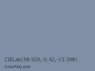 CIELab 58.929,-0.42,-13.398 Color is a normal blue color and the nearest color is Regent Gray #86949f. Hex code #808fa5 and RGB value is rgb(128,143,165). In RGB color space, this color is composed of 50% red, 56% green, 65% blue, In CMYK color space, this color is composed of 22% cyan, 13% magenta, 0% yellow , 35% black , In HSL color space, this color has a hue angle of 216° , 17% saturation and 57% lightness.