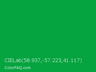 CIELab 58.937,-57.223,41.117 Color is a normal green color and the nearest color is Green Pantone #00ad43. Hex code #06a440 and RGB value is rgb(6,164,64). In RGB color space, this color is composed of 2% red, 64% green, 25% blue, In CMYK color space, this color is composed of 96% cyan, 0% magenta, 61% yellow , 36% black , In HSL color space, this color has a hue angle of 142° , 93% saturation and 33% lightness.