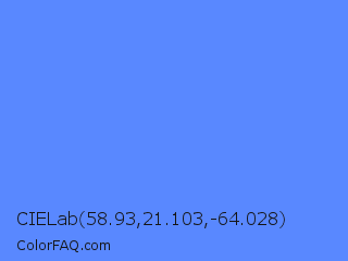 CIELab 58.93,21.103,-64.028 Color is a light blue color and the nearest color is Blueberry #4f86f7. Hex code #5988ff and RGB value is rgb(89,136,255). In RGB color space, this color is composed of 35% red, 53% green, 100% blue, In CMYK color space, this color is composed of 65% cyan, 47% magenta, 0% yellow , 0% black , In HSL color space, this color has a hue angle of 223° , 100% saturation and 67% lightness.