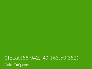 CIELab 58.942,-49.163,59.352 Color is a normal green color and the nearest color is Vida Loca #549019. Hex code #4aa109 and RGB value is rgb(74,161,9). In RGB color space, this color is composed of 29% red, 63% green, 4% blue, In CMYK color space, this color is composed of 54% cyan, 0% magenta, 94% yellow , 37% black , In HSL color space, this color has a hue angle of 94° , 89% saturation and 33% lightness.